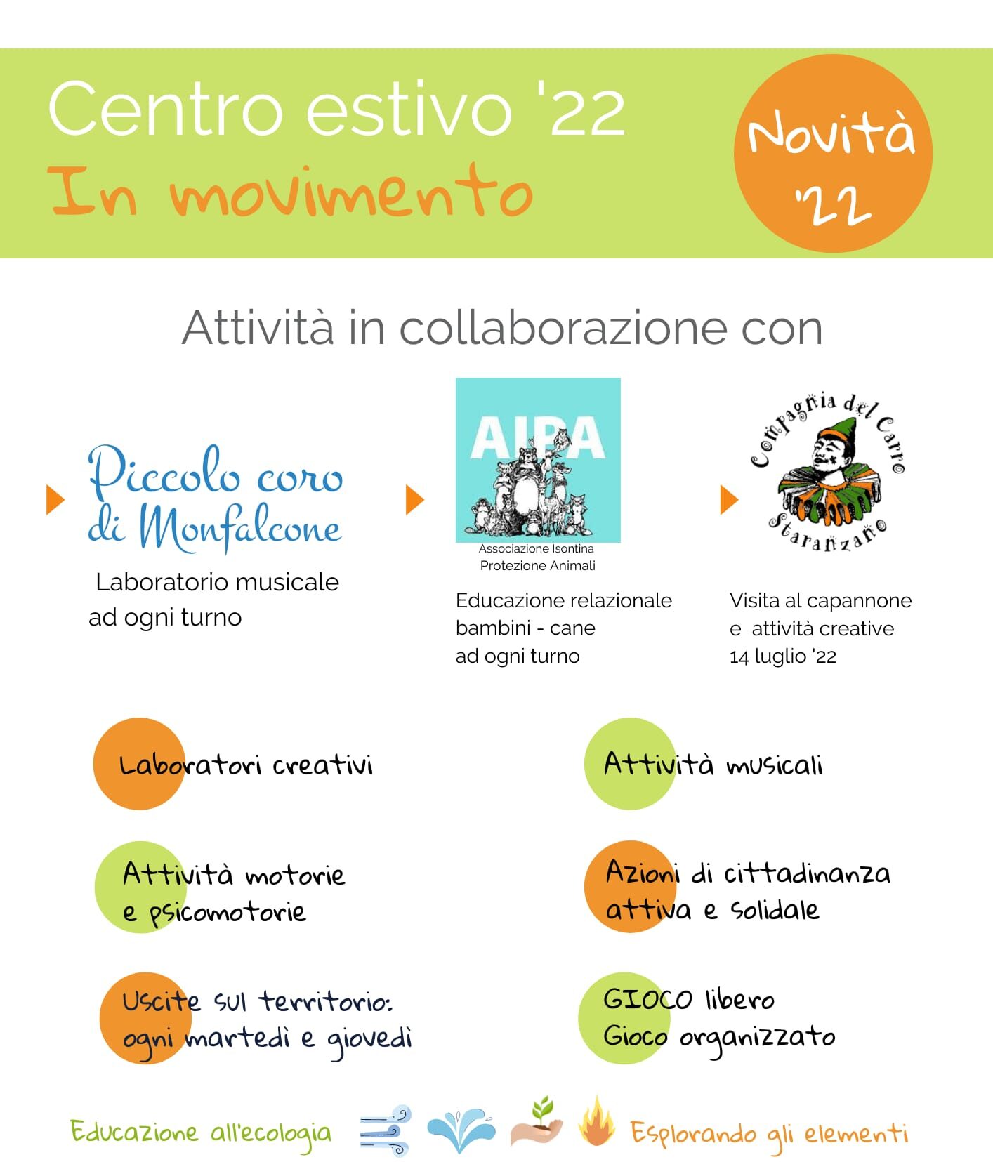 Grande novità sono le preziose collaborazioni con le associazioni Piccolo Coro di Monfalcone , con cui una volta alla settimana innalzeremo il livello dei nostri laboratori musicali e AIPA- Associazione Isontina Protezione Animali che una volta alla settimana realizzeranno un laboratorio di educazione interspecie portando i loro amici quattrozampe