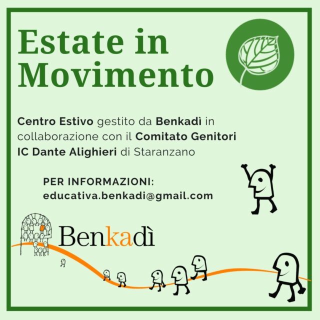 L’associazione Benkadì, in collaborazione con il Comitato Genitori IC Dante Alighieri di Staranzano e il Comune di Staranzano, vi presenta il centro estivo ESTATE in MOVIMENTO!