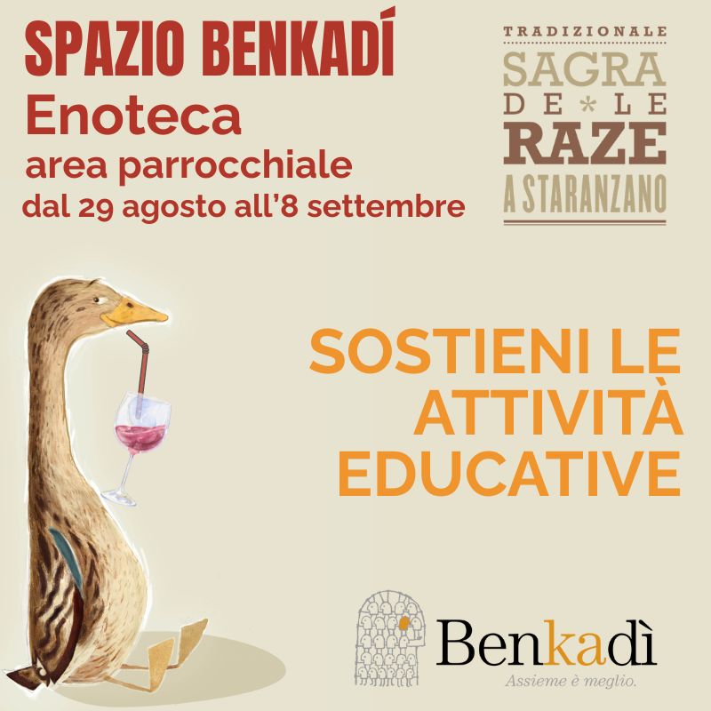 Dal 29 agosto all’8 settembre 2025 lo spazio Benkadì alla Sagra de le Raze offre buon vino, aperitivi, stuzzichini, pasticcio di raza, bevande analcoliche (tra cui la Gaza Cola) e tanto altro. Il chiosco è a sostegno delle attività educative di Benkadì.